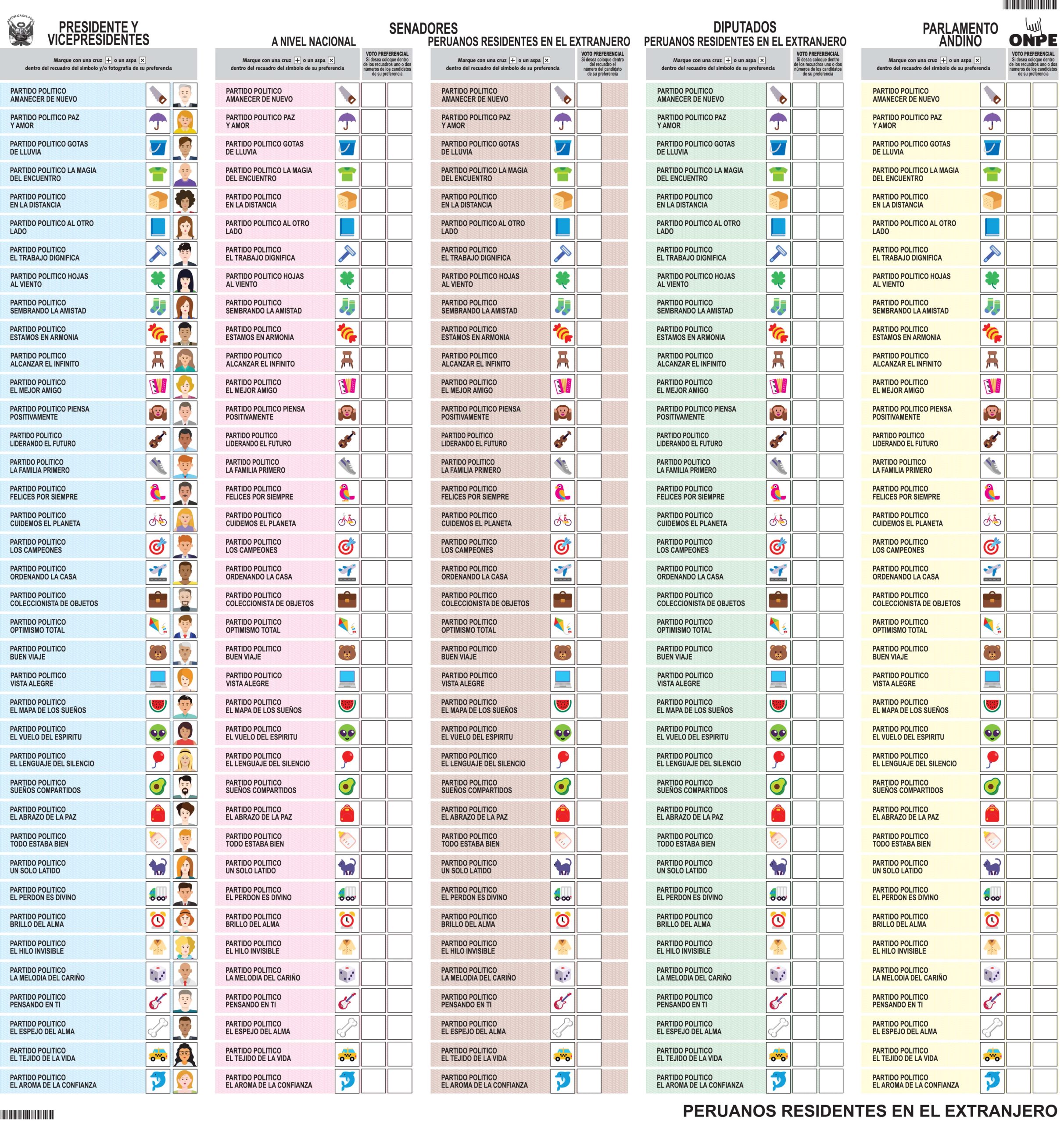 A continuación, puedes revisar el modelo de la cédula de votación para el exterior. La ubicación de los símbolos de las organizaciones políticas aún se encuentra pendiente, ya que será definida mediante sorteo el 12 de febrero de 2026.