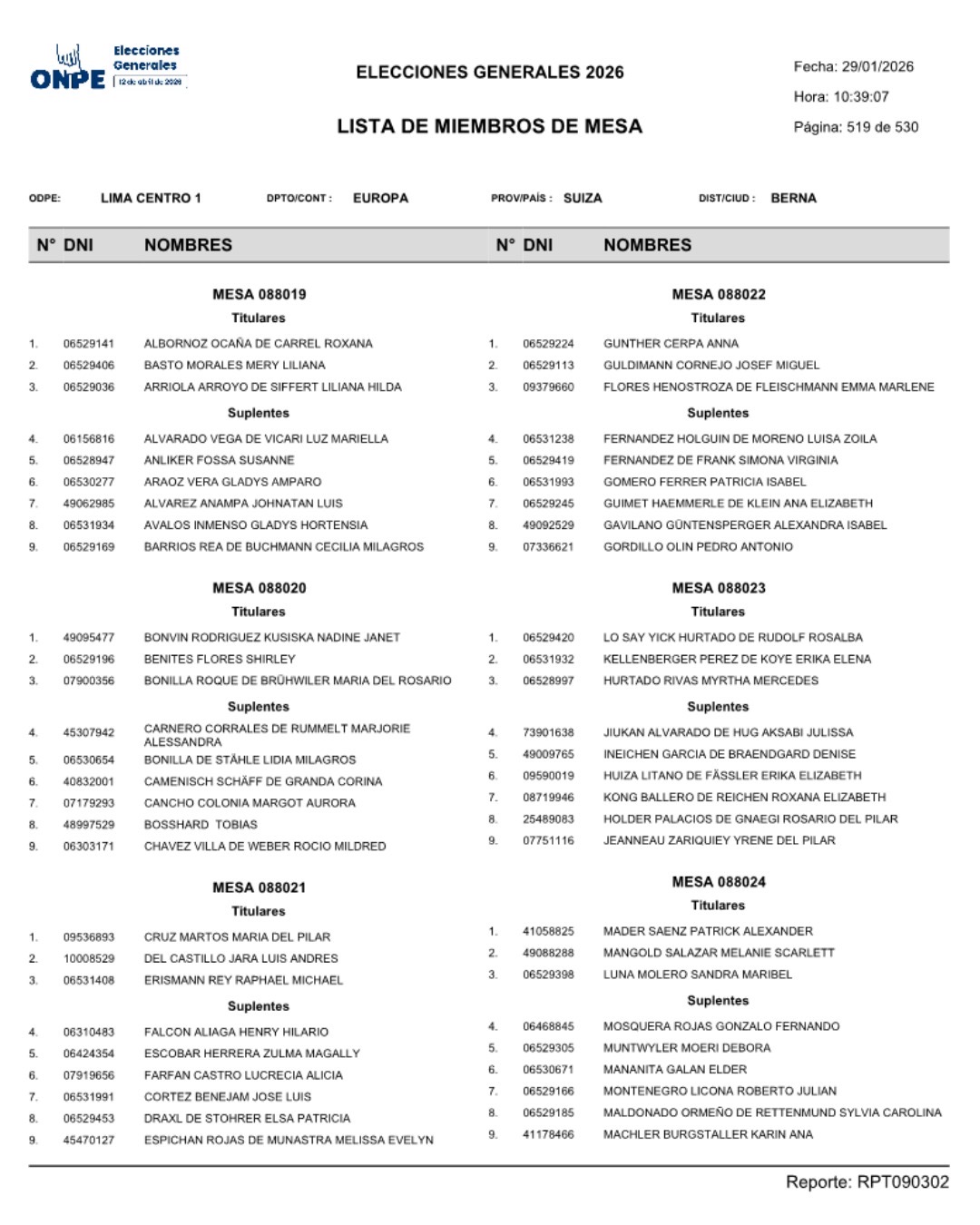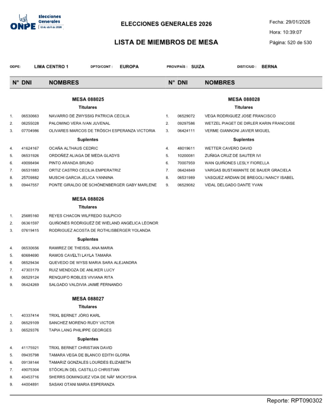 Compartimos la relación de los miembros de las mesas electorales que se instalarán en Berna para las Elecciones Generales del 12 de abril, conforme al sorteo realizado el viernes 29 de enero de 2026 en la ODPE Lima Centro 1.
